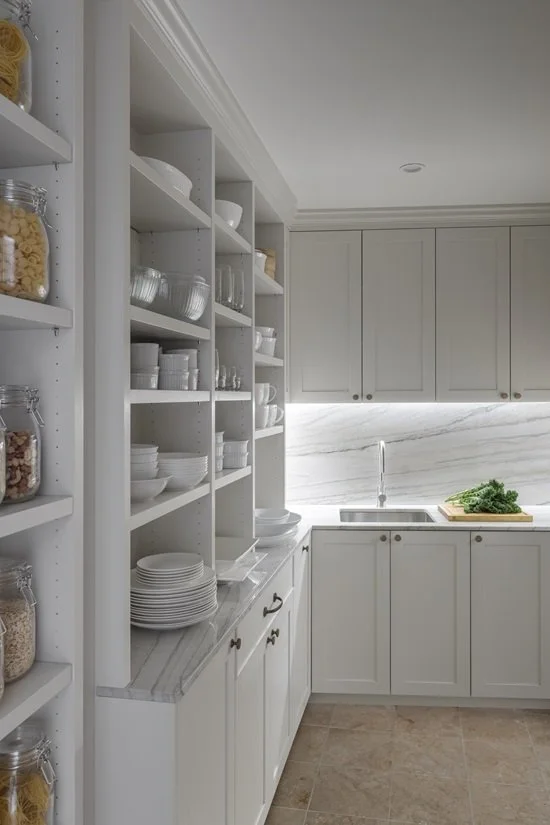Part of a full renovation of a five-bedroom home, this kitchen posed a special challenge. The owners wished to stay put throughout the home’s refurbishment, so Waller had to ensure a working kitchen from go to whoa. Also on the clients’ wish list was a larger butler’s pantry, more storage and to create visual continuity from the kitchen to the open-plan family room, included in the upgrade. Designed as a standalone kitchen, Waller completed the butler’s pantry first. Then turning to the main kitchen, he removed a wall between that and the formal dining to create a servery, which also opened up views to Sydney Harbour. White joinery in Tasmanian oak echoes the architraves throughout the open plan, while the island was painted a delicate eau de Nil blue, also used in the office niche, an ingenious repurposing of a stereo cupboard. Aged-brass drawer pulls and metal-mesh door fronts create visual links to fittings throughout the house.