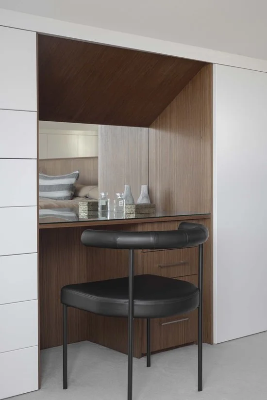 Blending historical charm with contemporary design, the project integrated a two-level main house with a three-bedroom lower apartment, creating unified living spaces spanning three levels. A beautifully crafted staircase and bespoke climate-controlled wine cellar beneath showcase Mr Waller’s meticulous attention to detail. Enjoying views of Sydney Harbour, the property reveals a light, neutral interior transitioning smoothly from traditional to contemporary detailing, with darker accents waterside. The design blends original period details with contemporary elements, offering a harmonious living experience. Intimate spaces at the entry lead to an expanded open-plan living-dining-kitchen area with full wall sliding doors opening to the extended terrace. The rear terrace features a Rio granite BBQ with a louvered privacy screen, defining the outdoor entertainment space and views across the water to Neutral Bay. The interior includes Vanilla Crème honed marble in the bathrooms and a stunning master suite with bespoke Boxwood veneer joinery.
